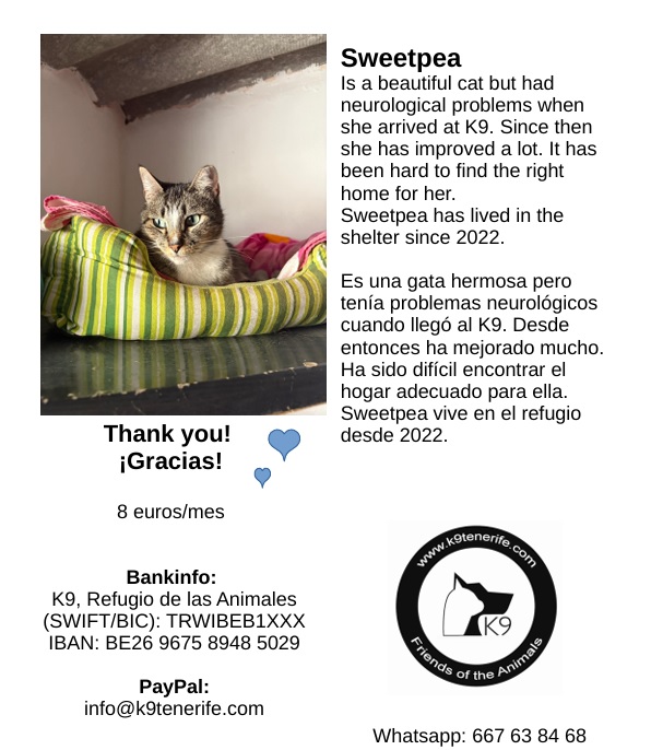 Sweetpea es una gata de 3 años de edad. Es muy tímida y asustadiza, por lo que no le gusta que le acaricien. Cuando llegó a k9 tenía problemas neruológicos, aunque ya hace vida normal. Sweetpea tiene un carácter muy tranquilo y, además, se lleva bien con el resto de gatos de la gatera.